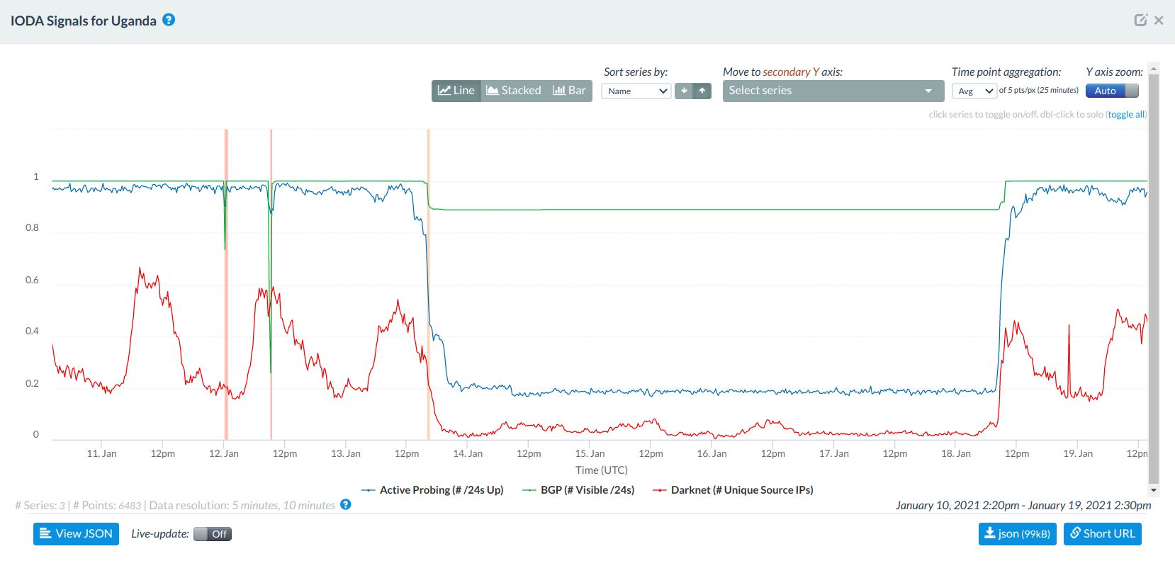 IODA data (above) shows a major drop in both Active Probing and IBR signals, starting at around 16:00 UTC on 13th January 2021, and lasting up until around 09:30 UTC on 18th January 2021. We also observe a drop in the BGP signal correlating in time with the drop in the other signals. As we see that all these signals resume to their previous levels on 18th January 2021, IODA data strongly indicates that Uganda experienced a widespread Internet outage.
