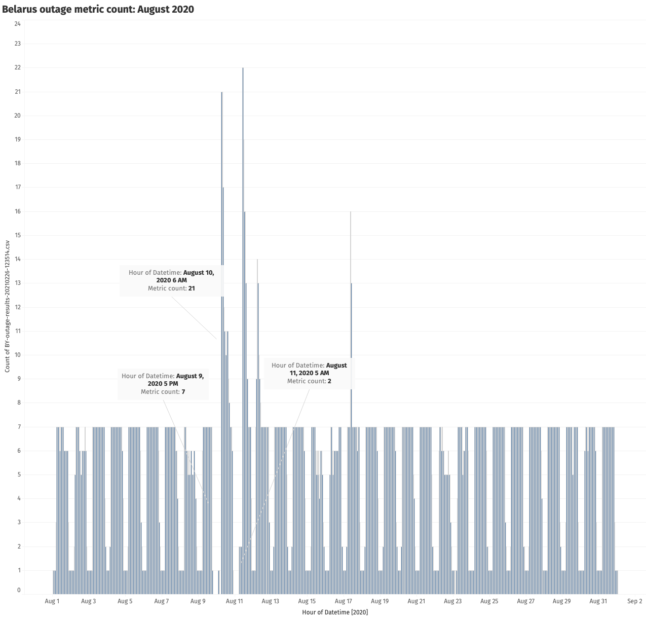 By looking at Mozilla telemetry (above) from Belarus on the evening of 9th August 2020, we can see that the number of locations submitting metrics starts dropping at around 17:00 UTC. This is followed by a complete absence of metrics until 10th August 2020 at 17:00 UTC. Thereafter, we can see that metrics start being submitted again for some hours until 20:00 UTC. After that there is another interruption in metric submission, until traffic appears to fully resume on 11th August 2020 at 05:00 UTC.