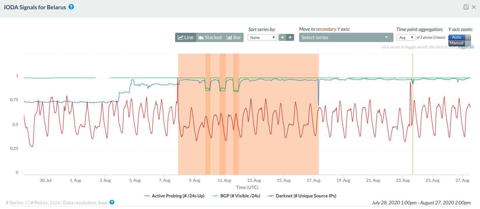 Source: Internet Outage Detection and Analysis (IODA): Belarus (August 2020), https://ioda.caida.org/ioda/dashboard#view=inspect&entity=country/BY&lastView=overview&from=1596114973&until=1598534173
